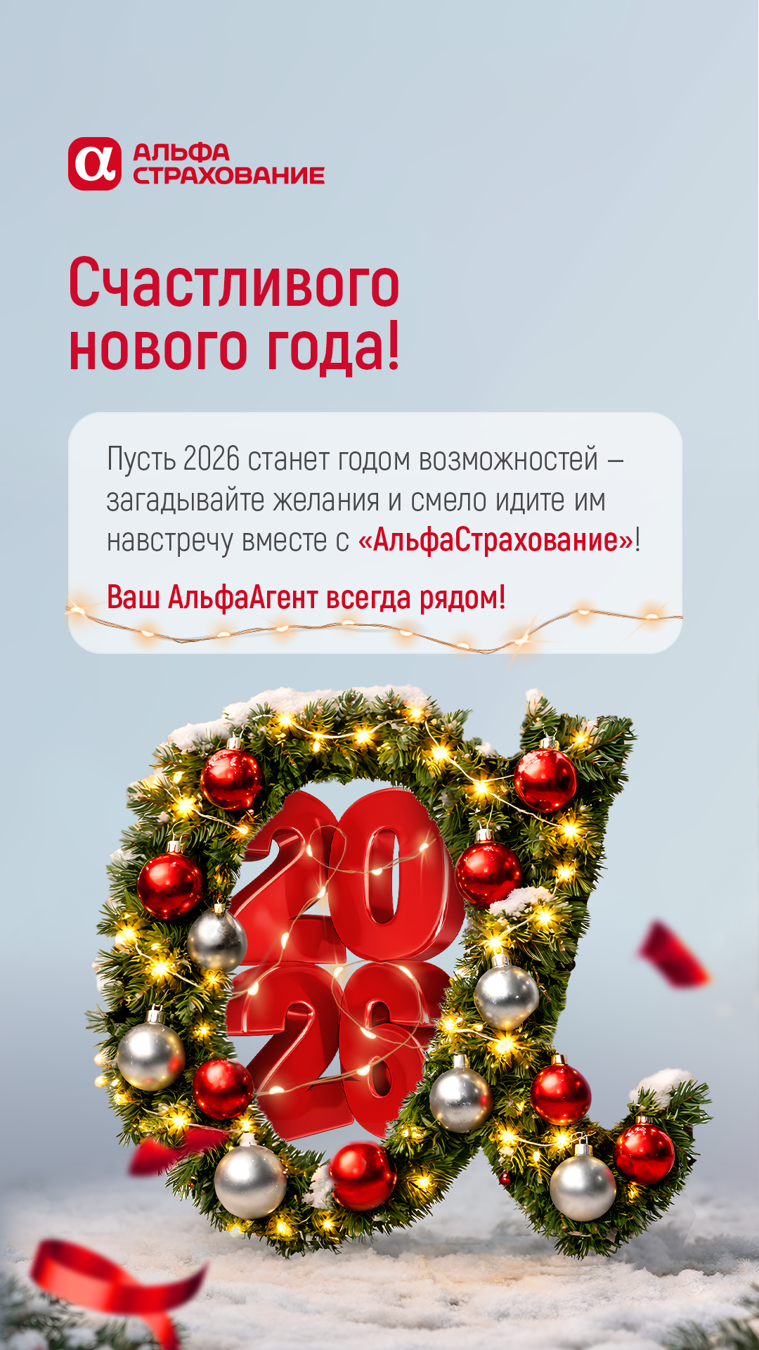 Счастливого нового года! Пусть 2026 станет годом возможностей — загадывайте желания и смело идите им навстречу вместе с «АльфаСтрахование»!